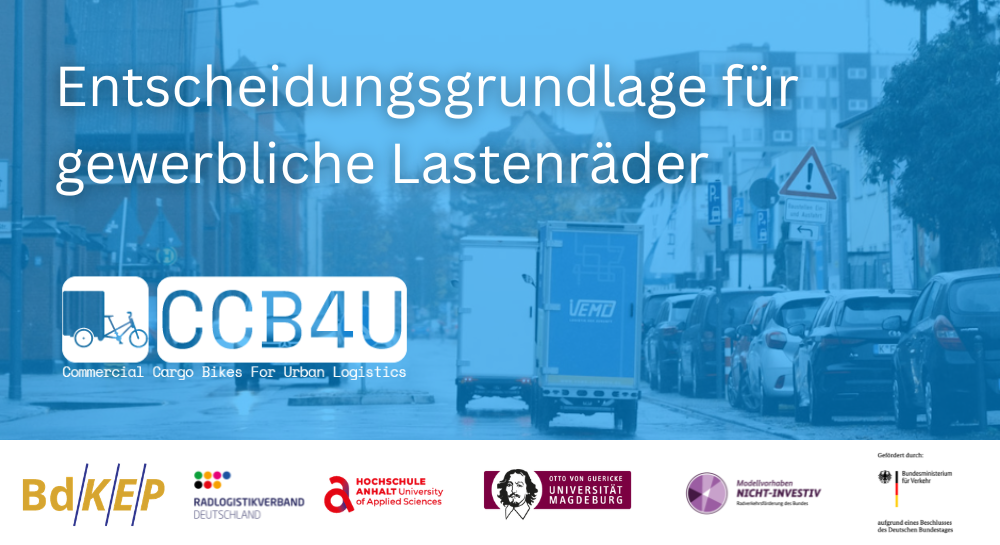 Berlin, 26. März 2026 – Der Radlogistikverband Deutschland e.V. (RLVD) und der Bundesverband der Kurier-Express-Post-Dienste e.V. (BdKEP) engagieren sich gemeinsam im Forschungsprojekt CCB4U – Commercial Cargo Bikes for Urban Logistics. Unter der Federführung der Otto-von-Guericke-Universität Magdeburg (OVGU) wird gemeinsam mit der Hochschule Anhalt (HSA) ein digitales Planungswerkzeug entwickelt, welches Logistikunternehmen bei der Entscheidung hilft, ob und wie sich gewerbliche Lastenräder in ihren Betrieb integrieren lassen.